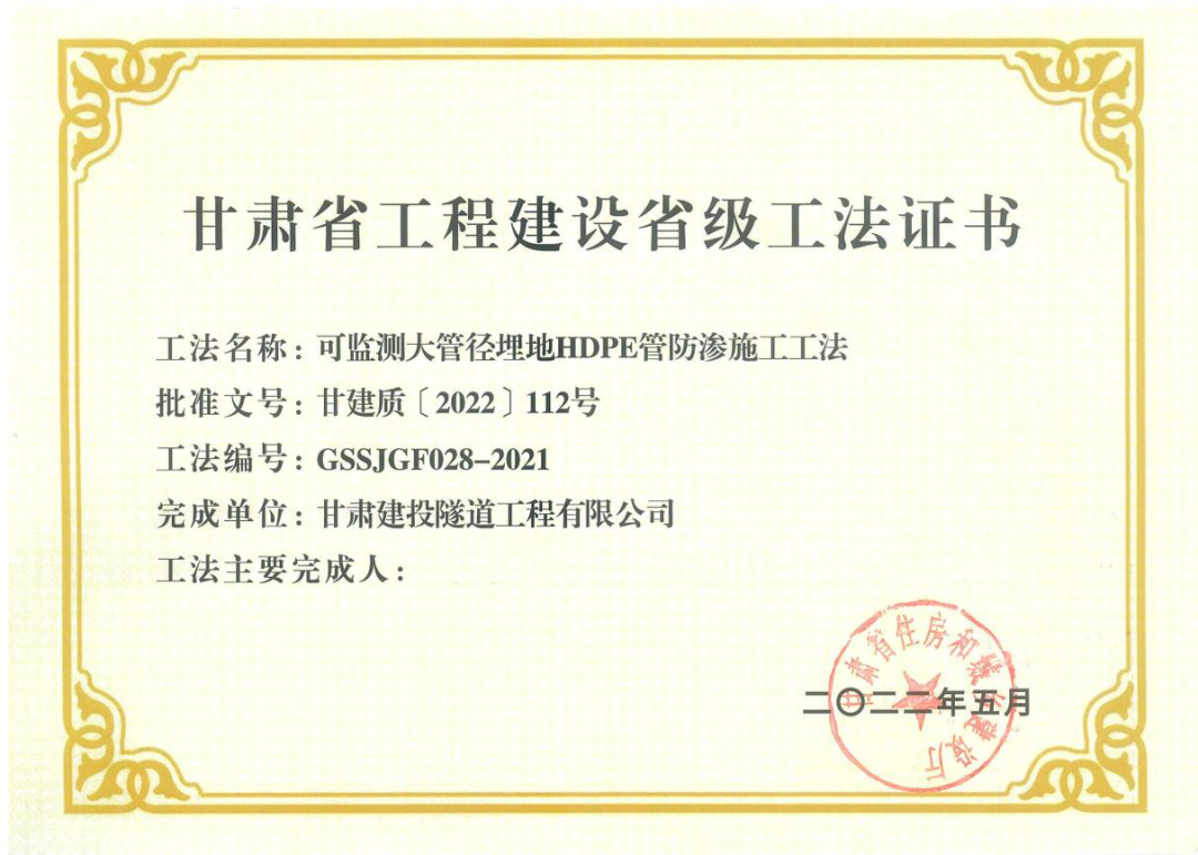 近日,從甘肅省住建廳官網(wǎng)獲悉,隧道公司申報(bào)的《可監(jiān)測(cè)大管徑埋地HDPE管防滲施工工法》獲評(píng)2021年度甘肅省工程建設(shè)省級(jí)工法。