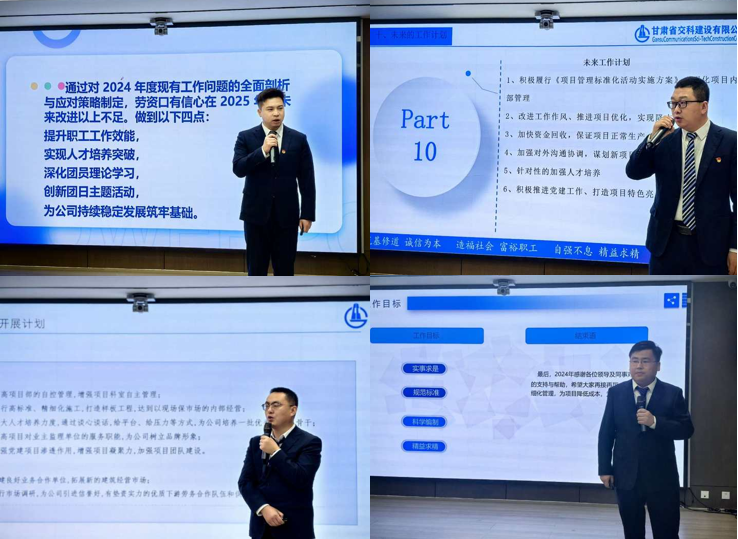 2025年是實現(xiàn)“十四五”規(guī)劃目標(biāo)任務(wù)的關(guān)鍵一年,也是交科公司三公司實現(xiàn)管理提升的突破一年,我們要緊跟集團公司及公司發(fā)展步伐,落實好如下工作:一是加強學(xué)習(xí),實現(xiàn)綜合提升。堅持學(xué)理論知識,提政治素養(yǎng)。學(xué)業(yè)務(wù)技能,提履職能力;二是奮力拼搏,推進(jìn)全員經(jīng)營新局面。全體職工要主動擔(dān)當(dāng)作為,在深耕蘭州新區(qū)主陣地的同時積極“走出去”,全力開拓臨夏、慶陽、平?jīng)龅仁?nèi)外新市場。在做強市政、基礎(chǔ)設(shè)施板塊的同時努力向水利水電、城市更新等新領(lǐng)域、新賽道全面邁進(jìn);三是強抓落實,推動管理再上新臺階。緊緊圍繞“強管理、抓效能、提服務(wù)、樹品牌”這一目標(biāo),著力提升職工安全質(zhì)量和成本管控意識、健全成本管控體系、夯實成本控制責(zé)任,切實提升工作效率,促進(jìn)各項工作走深走實;四是釋放潛能,激發(fā)人才活力。要關(guān)注職工成長和職業(yè)發(fā)展規(guī)劃,為職工提供施展才干的有效平臺。五是統(tǒng)一思想、凝聚共識、共謀發(fā)展。要始終秉持“發(fā)展企業(yè) 富裕職工”的理念,一切工作要以全體職工的切身利益為出發(fā)點和落腳點,上下一心、同舟共濟,為全面完成2025年各項任務(wù)指標(biāo)接續(xù)奮斗。