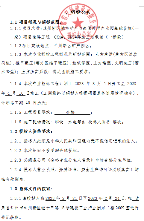 蘭州新區(qū)城市礦產與表面處理產業(yè)園基礎設施(一期)項目道路工程—CK4#、CK5#路施工總承包(一標段)土方工程招標公告