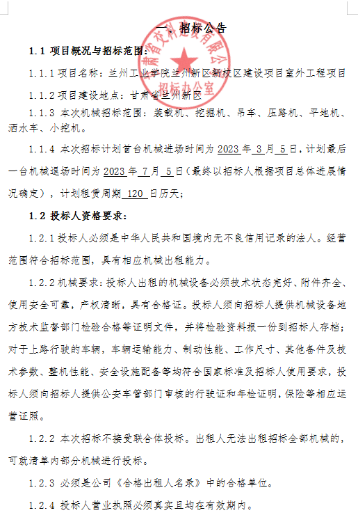蘭州工業(yè)學(xué)院蘭州新區(qū)新校區(qū)建設(shè)項目室外工程項目機械租賃招標(biāo)公告