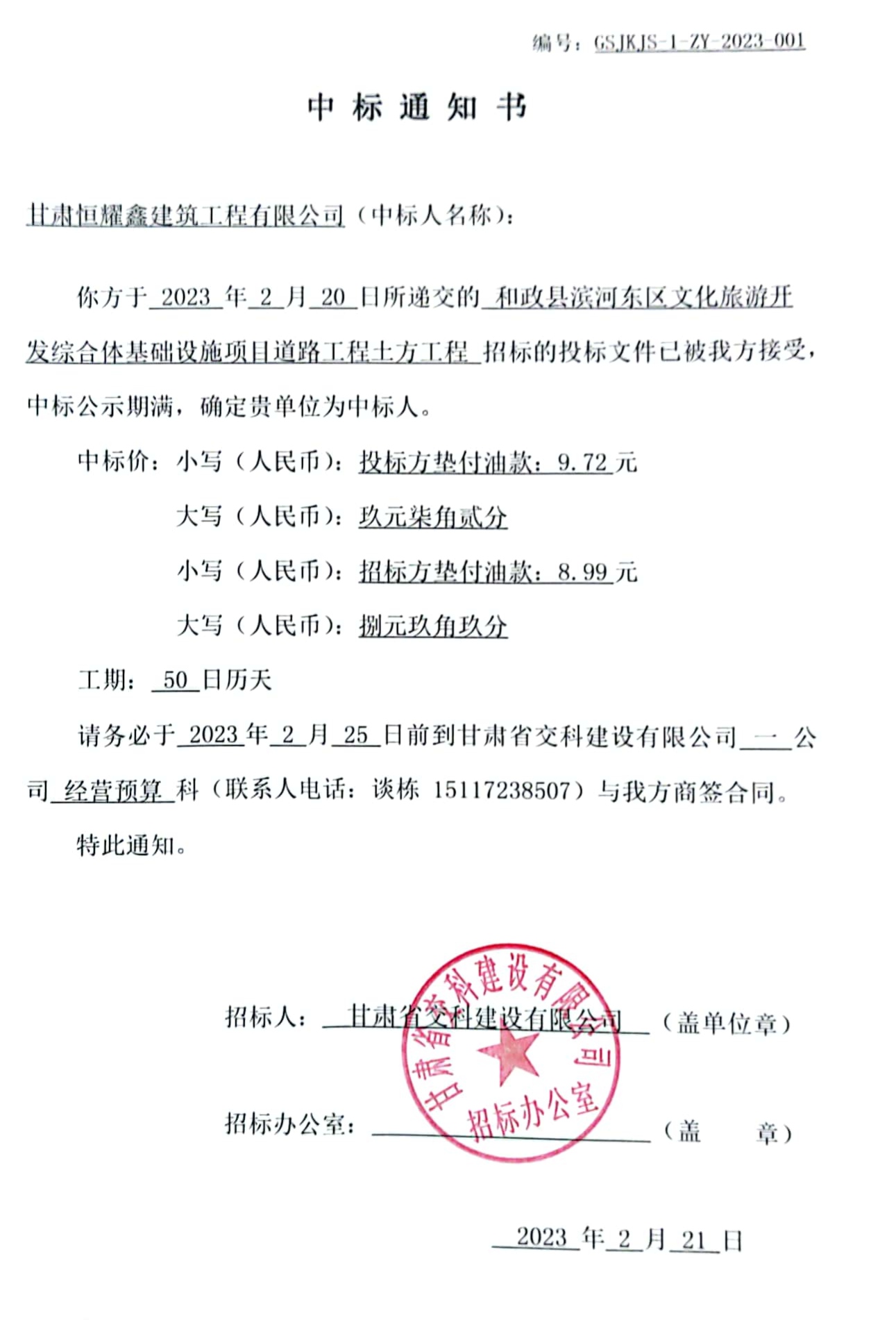 和政縣濱河東區(qū)文化旅游開發(fā)綜合體基礎設施項目道路工程土方工程中標候選人及中標通知書