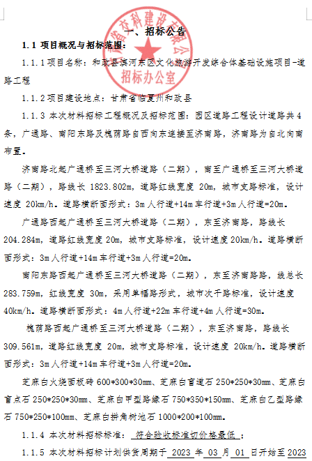 和政縣濱河?xùn)|區(qū)文化旅游開發(fā)綜合體基礎(chǔ)設(shè)施項(xiàng)目-道路工程材料招標(biāo)公告