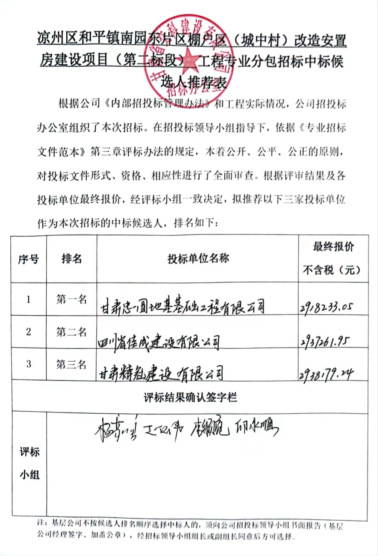 涼州區(qū)和平鎮(zhèn)南園東片區(qū)棚戶區(qū)(城中村)改造安置房建設項目(第二標段)中標候選人及中標通知書
