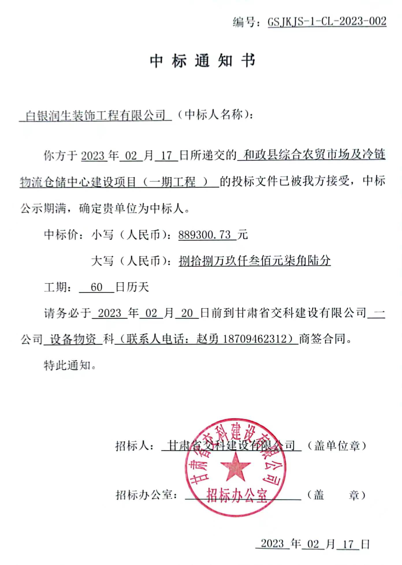 和政縣綜合農(nóng)貿(mào)市場及冷鏈物流倉儲(chǔ)中心建設(shè)項(xiàng)目(一期工程 )材料招標(biāo)中標(biāo)候選人及中標(biāo)通知書