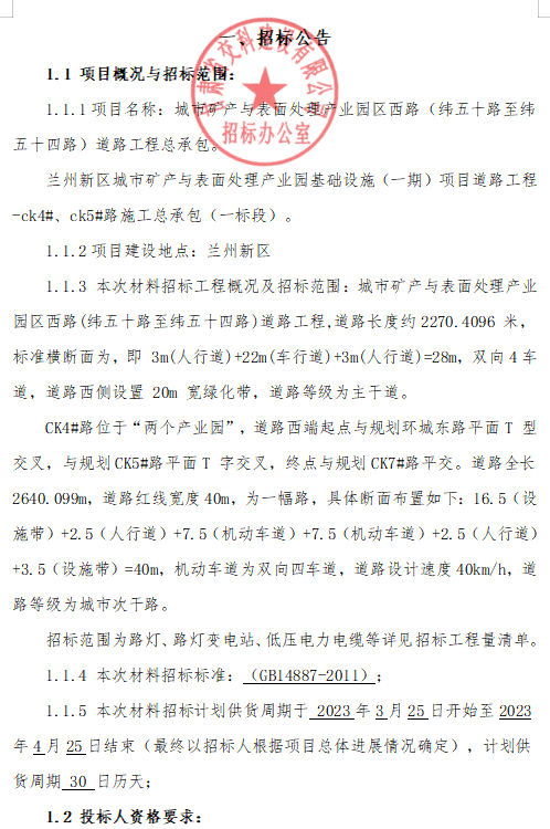 城市礦產(chǎn)與表面處理產(chǎn)業(yè)園區(qū)西路(緯五十路至緯五十四路)道路工程總承包 蘭州新區(qū)城市礦產(chǎn)與表面處理產(chǎn)業(yè)園基礎(chǔ)設(shè)施(一期)項(xiàng)目道路工程-ck4#、ck5#路施工總承包(一標(biāo)段)招標(biāo)公告