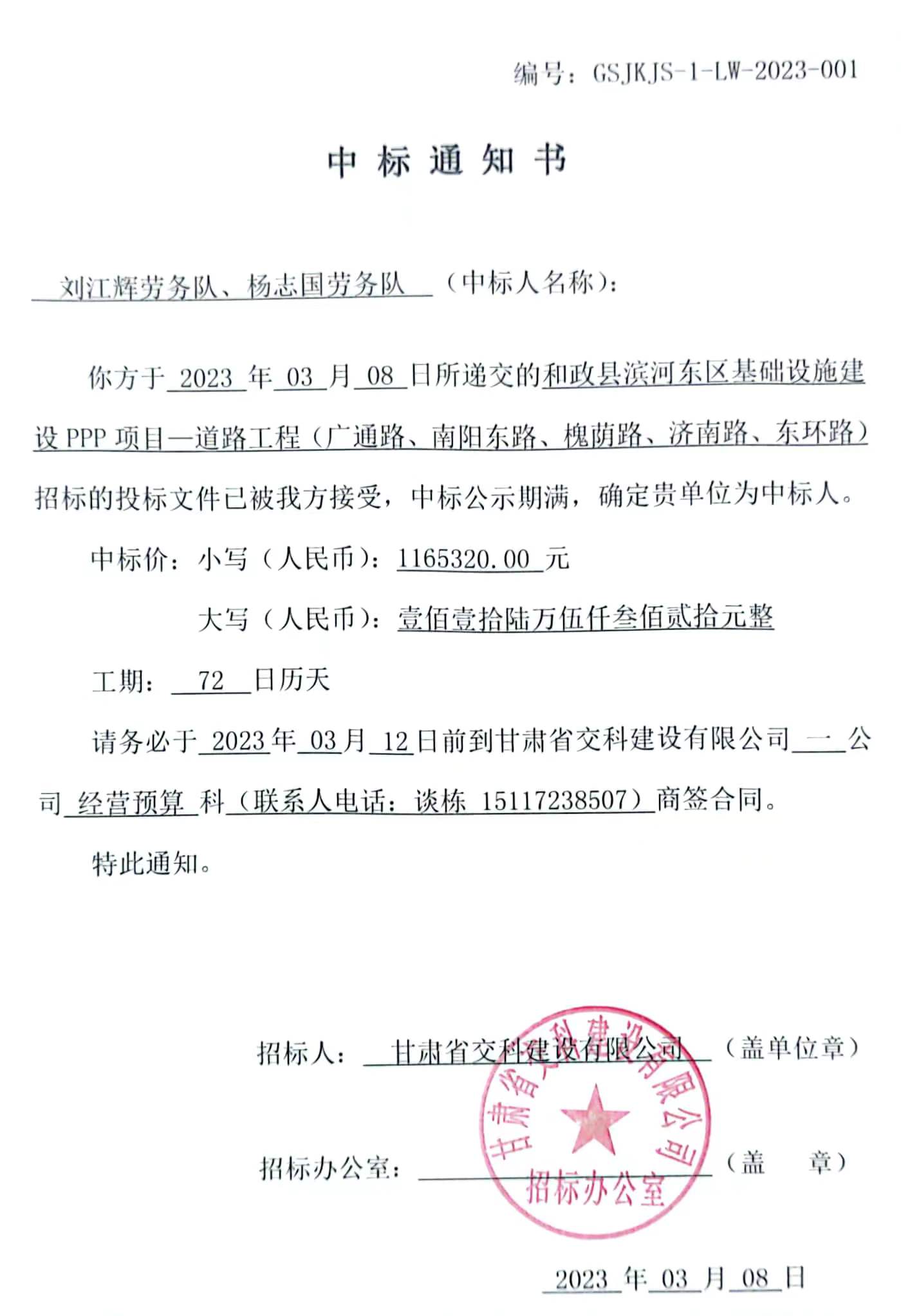 和政縣濱河東區(qū)基礎(chǔ)設施建設PPP項目—道路工程(廣通路、南陽東路、槐蔭路、濟南路、東環(huán)路)中標候選人及中標通知書