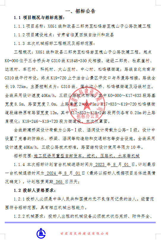 X051線和政縣二郎崗至松鳴巖至槐山子公路改建工程機械租賃招標公告