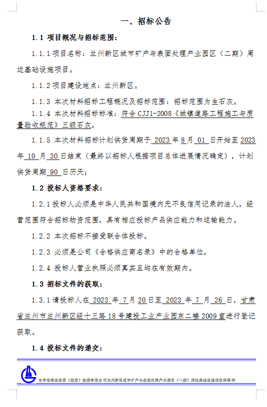 蘭州新區(qū)城市礦產(chǎn)與表面處理產(chǎn)業(yè)園區(qū)(二期)周邊基礎(chǔ)設(shè)施項目生石灰招標公告