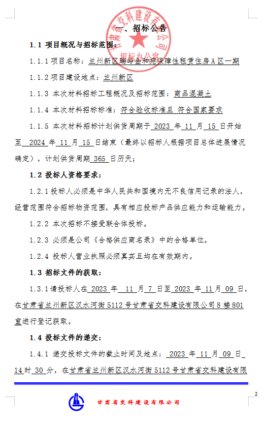 蘭州新區(qū)瑞嶺金和苑保障性租賃住房A區(qū)一期-混凝土招標公告
