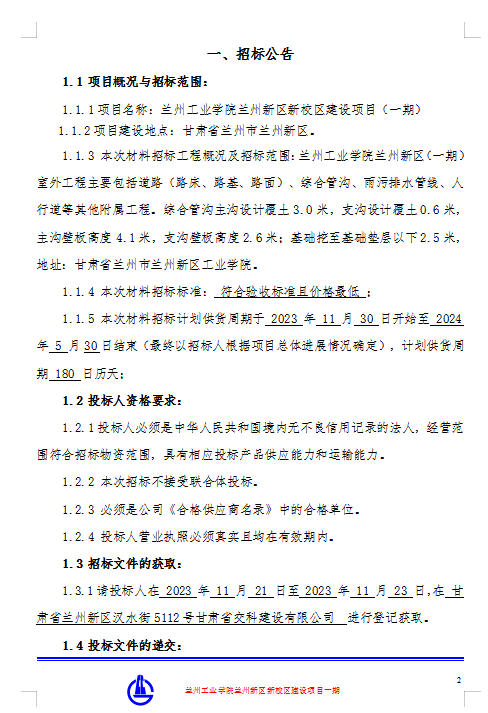 蘭州工業(yè)學院蘭州新區(qū)新校區(qū)建設項目(一期)--材料招標公告