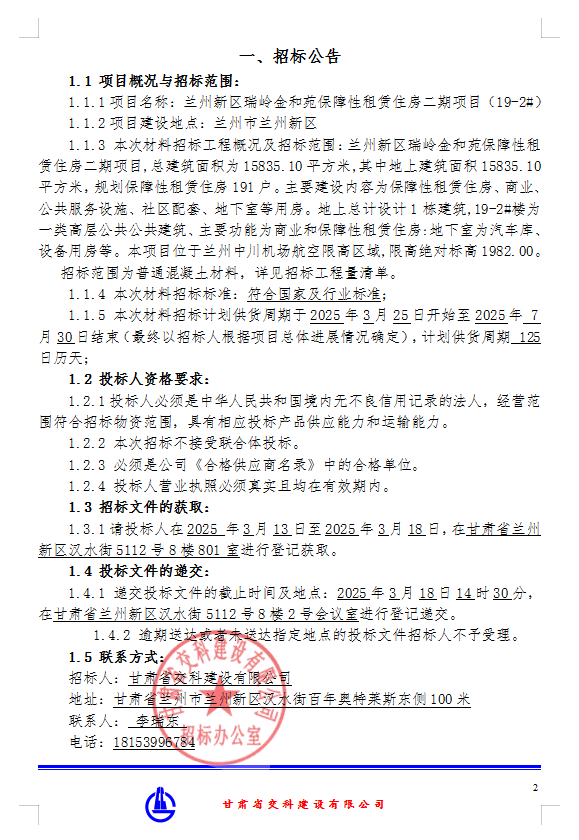 蘭州新區(qū)瑞嶺金和苑保障性租賃住房二期項(xiàng)目(19-2#)混凝土招標(biāo)公告
