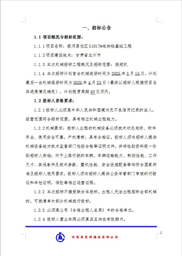 銀河居住區(qū)G1817#地塊樁基工程旋挖機招標公告