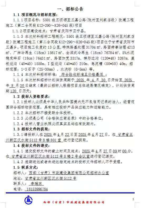 S501線五頃塬至三嘉公路(張村至劉家店段)改造工程施工(第二合同段K12+290-K26+045段)項(xiàng)目石子及水洗砂招標(biāo)公告