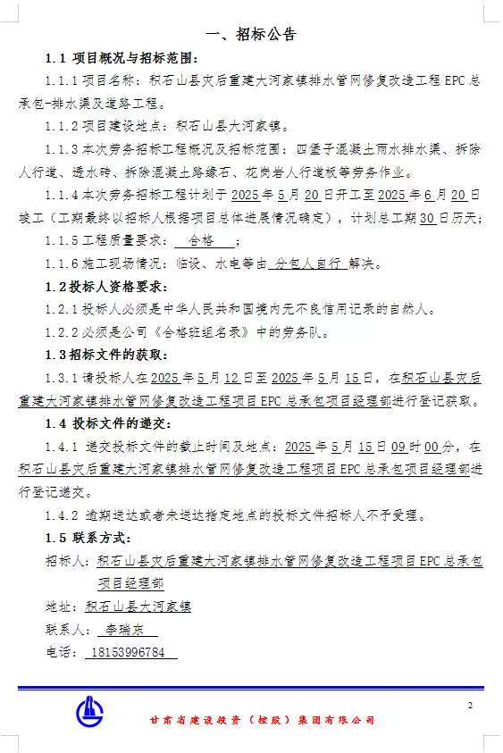 積石山縣災(zāi)后重建大河家鎮(zhèn)排水管網(wǎng)修復(fù)改造工程EPC總承包-排水渠及道路工程-勞務(wù)分包招標(biāo)公告