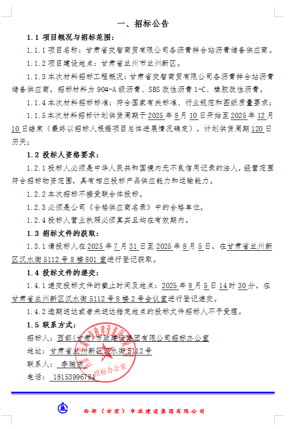 甘肅省交智商貿(mào)有限公司各瀝青拌合站瀝青儲(chǔ)備供應(yīng)商-材料招標(biāo)公告