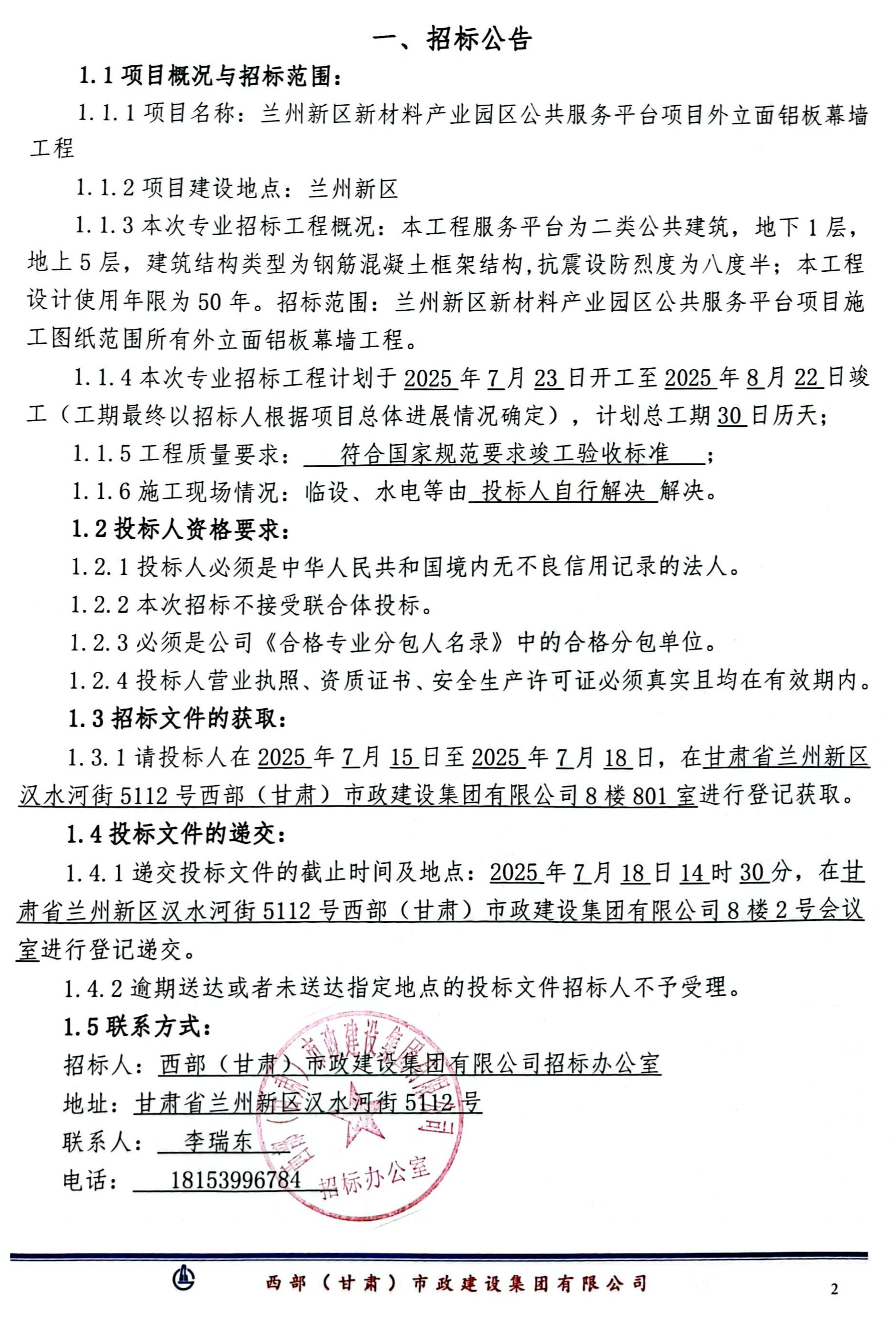 蘭州新區(qū)新材料產(chǎn)業(yè)園區(qū)公共服務(wù)平臺(tái)項(xiàng)目外立面鋁板幕墻工程-專業(yè)分包-招標(biāo)公告