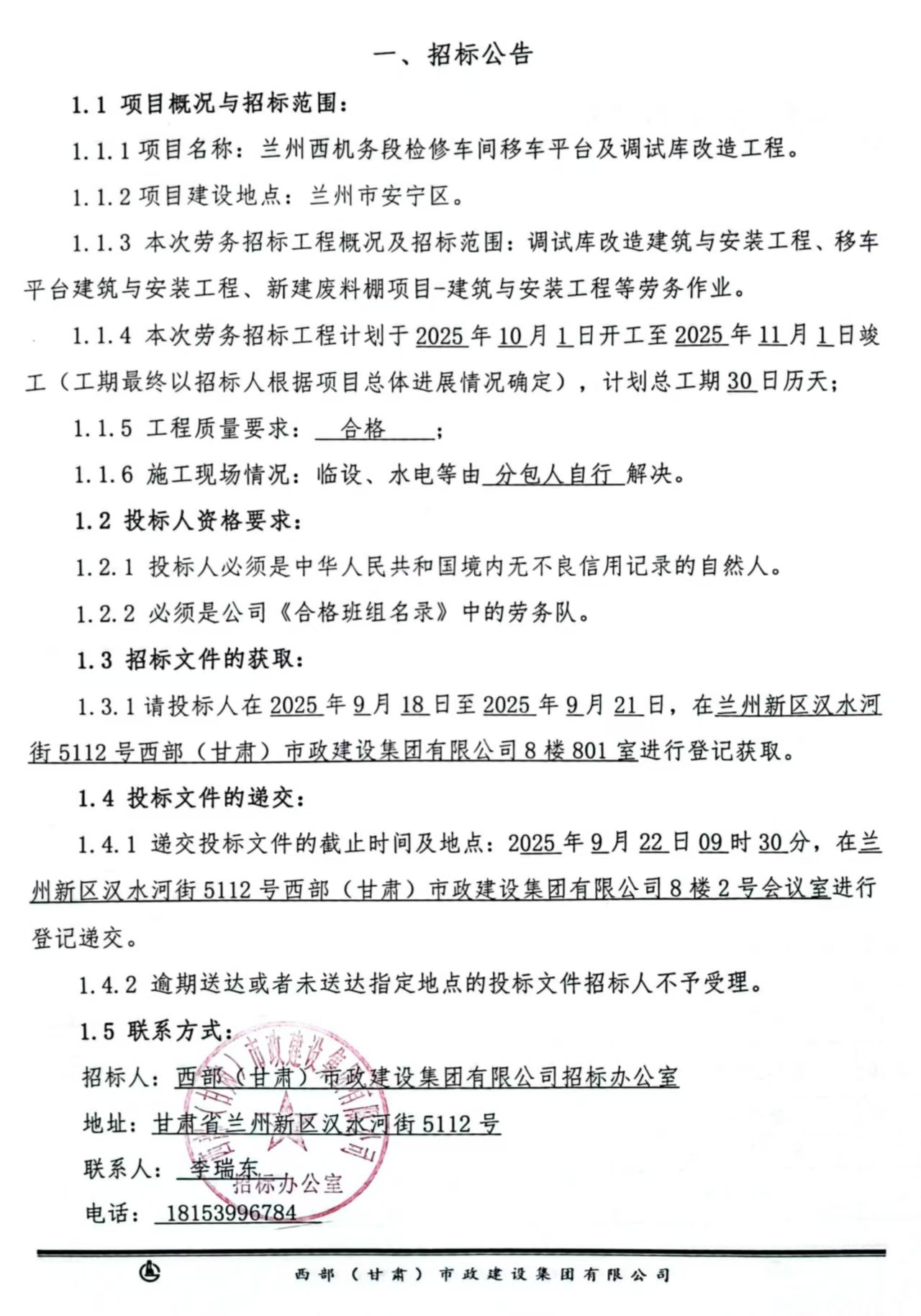 蘭州西機務段檢修車間移車平臺及調(diào)試庫改造工程-勞務分包招標公告