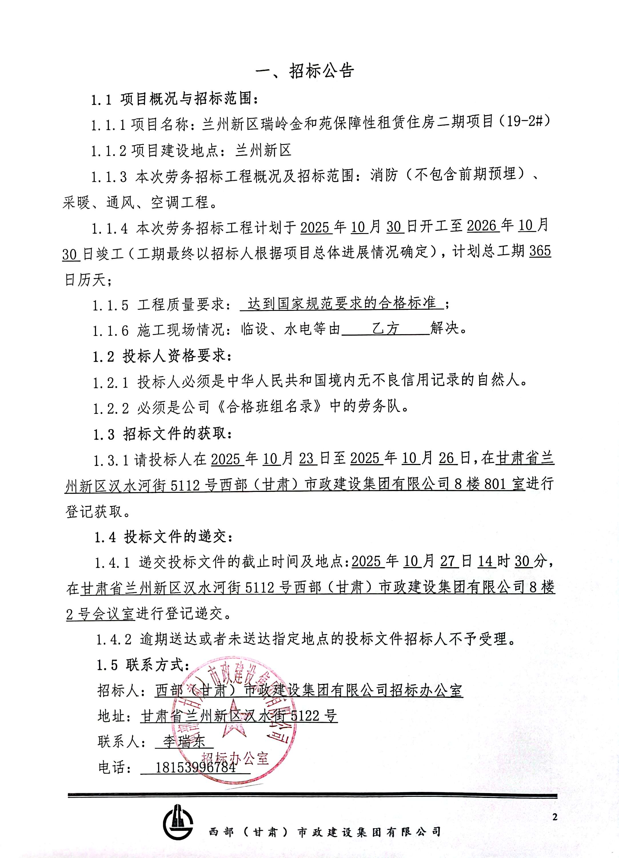 蘭州新區(qū)瑞嶺金和苑保障性租賃住房二期項(xiàng)目(19-2#)-消防(不包含前期預(yù)埋)、采暖、通風(fēng)、空調(diào)工程-招標(biāo)公告