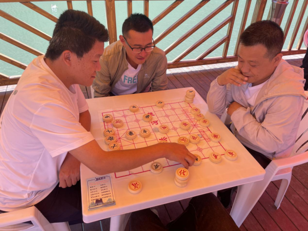 在經(jīng)過體力腦力雙重考驗后,雙方公司派出棋手展開棋盤爭霸賽。棋手們以棋會友,全神貫注地排兵布陣,聚精會神地思索著每步棋的走法、布局、進(jìn)攻與退守,在方寸棋盤間上演了一場場精彩絕倫的對弈。