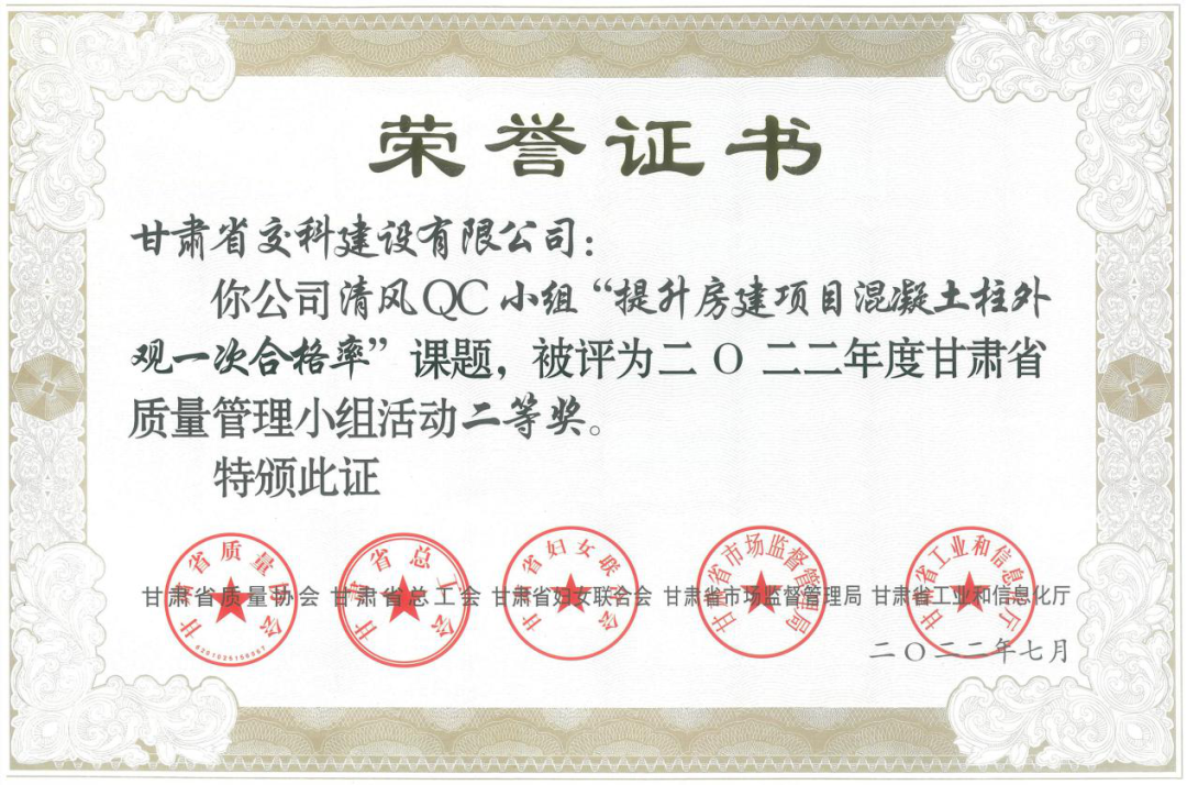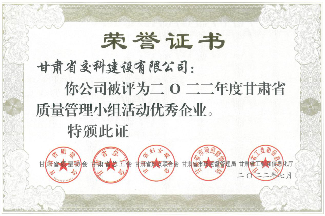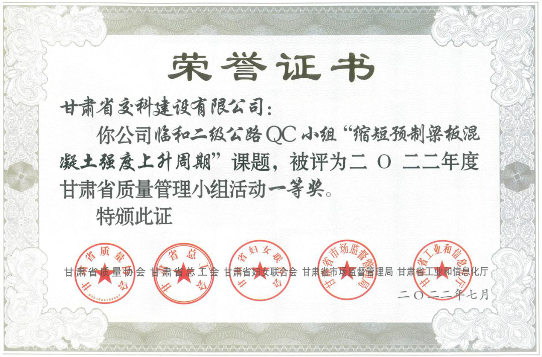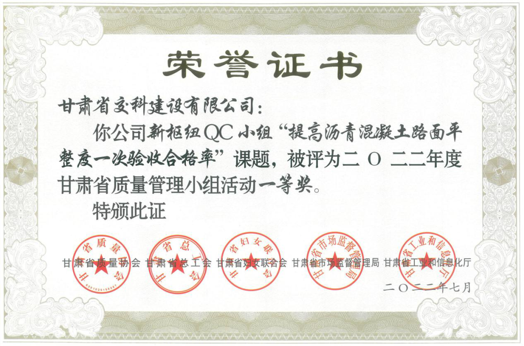 截至目前,交科公司連續(xù)三年榮獲“甘肅省質(zhì)量管理小組活動(dòng)優(yōu)秀企業(yè)”榮譽(yù)稱號,共擁有省級QC成果特等獎(jiǎng)2項(xiàng)、一等獎(jiǎng)18項(xiàng)、二等獎(jiǎng)3項(xiàng)。