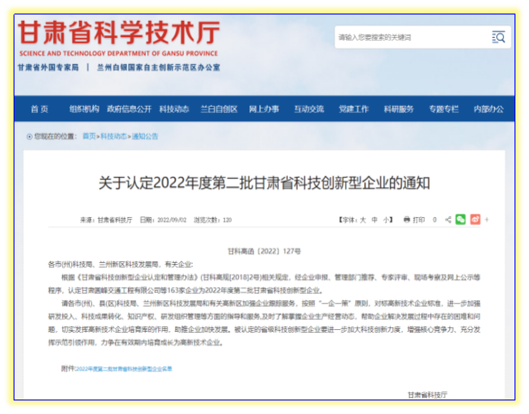 近日,2022年度第二批甘肅省科技創(chuàng)新型企業(yè)名單公布,甘肅建投路政建設(shè)科技有限公司被認定為“甘肅省科技創(chuàng)新型企業(yè)”。