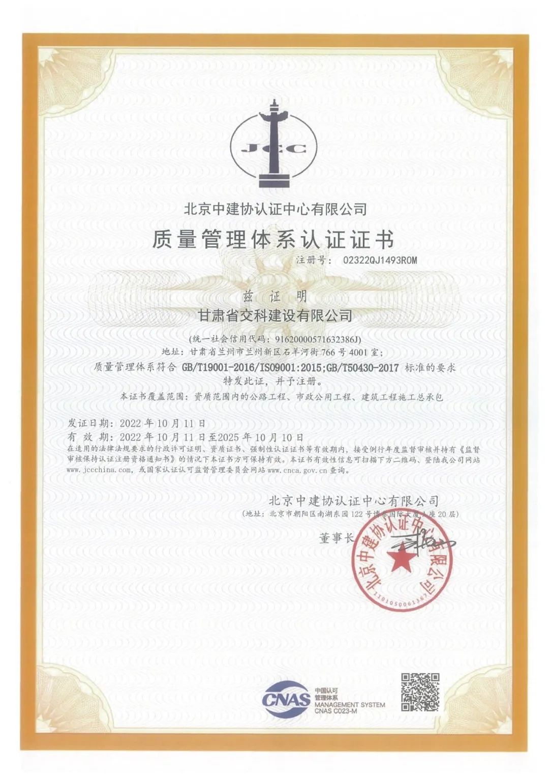 近日,甘肅省交科建設(shè)有限公司順利通過北京中建協(xié)認(rèn)證中心“三體系”一、二階段審核,并順利取得審核中心頒發(fā)的質(zhì)量、環(huán)境、職業(yè)健康安全管理體系認(rèn)證證書。