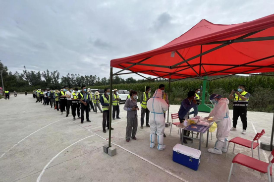 “請(qǐng)大家佩戴好口罩,出示本人健康碼,測(cè)溫登記后十人一組在這邊排隊(duì),保持一米間隔!”項(xiàng)目部疫情防控工作小組積極響應(yīng),主動(dòng)配合醫(yī)護(hù)人員進(jìn)行核酸檢測(cè)工作。不到2小時(shí),項(xiàng)目二百余名參建人員順利完成核酸檢測(cè)。