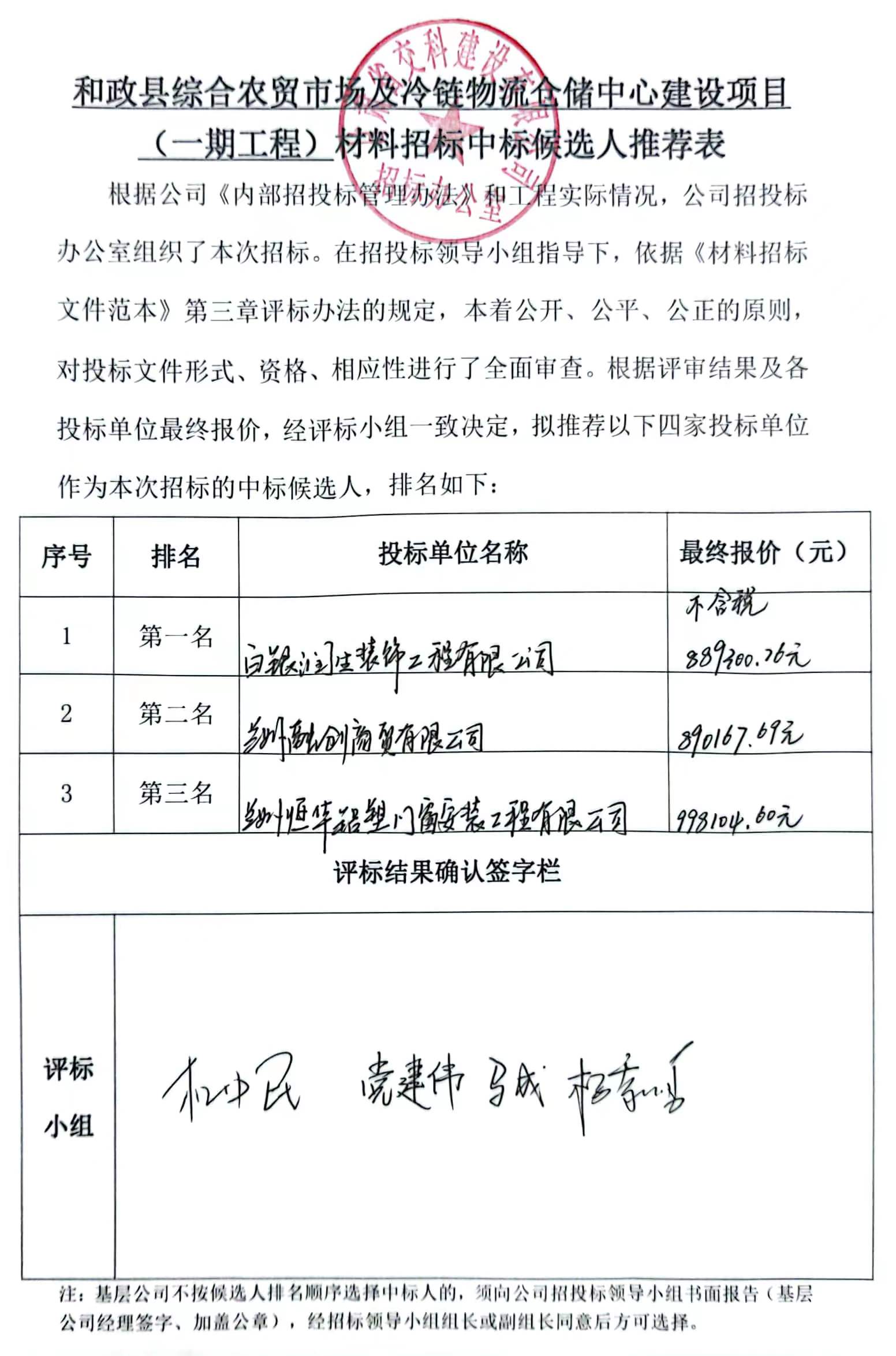 和政縣綜合農(nóng)貿(mào)市場(chǎng)及冷鏈物流倉(cāng)儲(chǔ)中心建設(shè)項(xiàng)目(一期工程 )材料招標(biāo)中標(biāo)候選人及中標(biāo)通知書