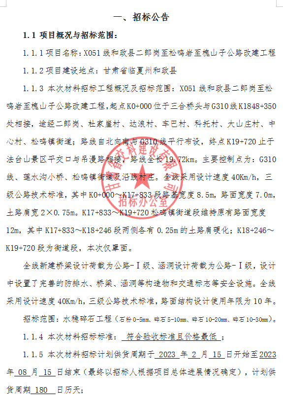 X051線和政縣二郎崗至松鳴巖至槐山子公路改建工程水穩(wěn)碎石材料招標(biāo)