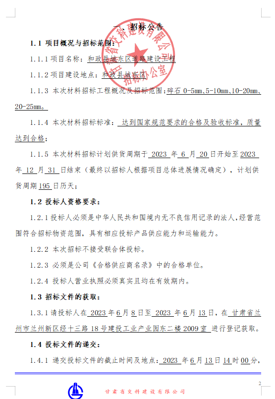 和政縣城東區(qū)道路建設(shè)工程-碎石招標(biāo)