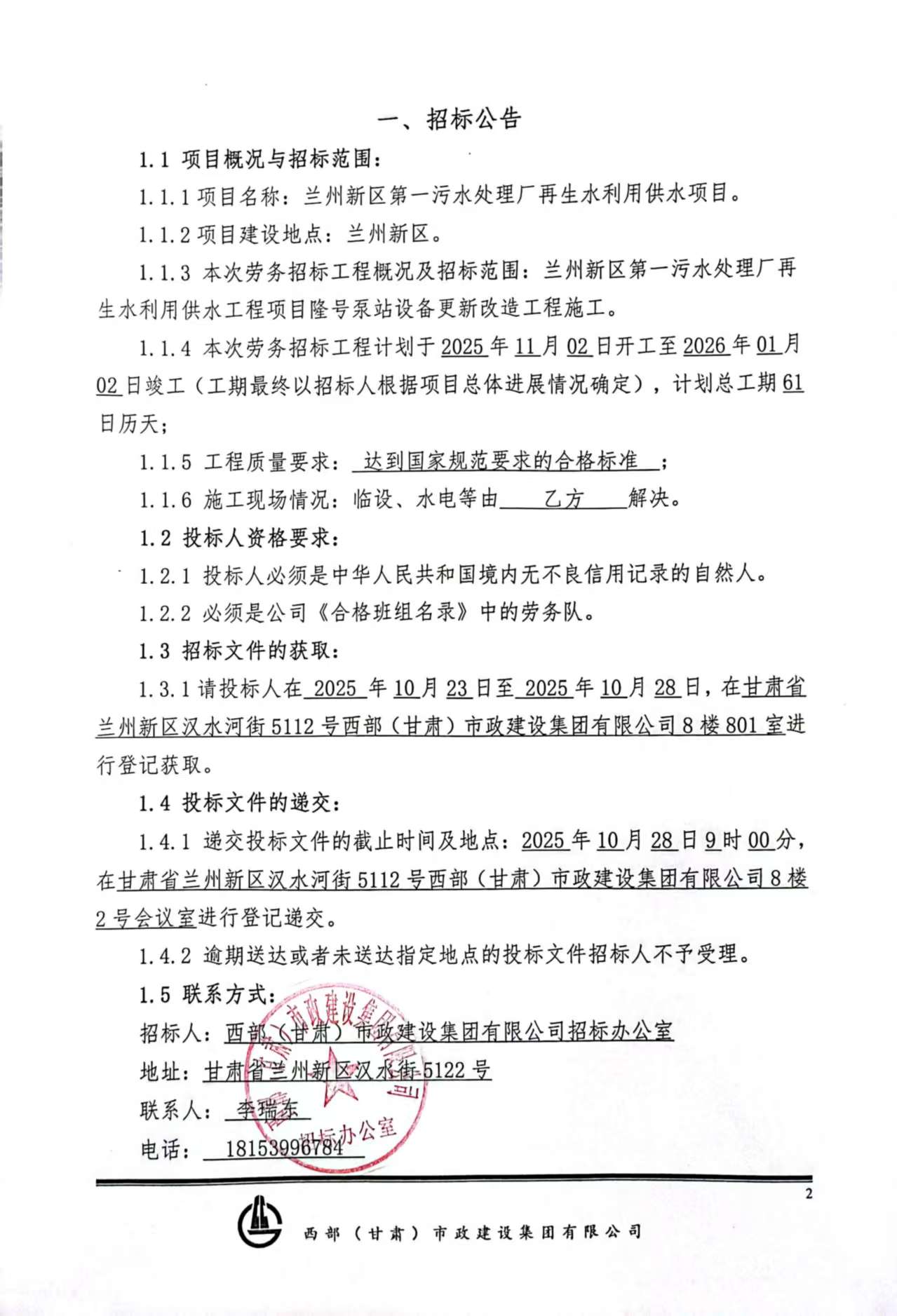 蘭州新區(qū)第一污水處理廠再生水利用供水項目-招標公告