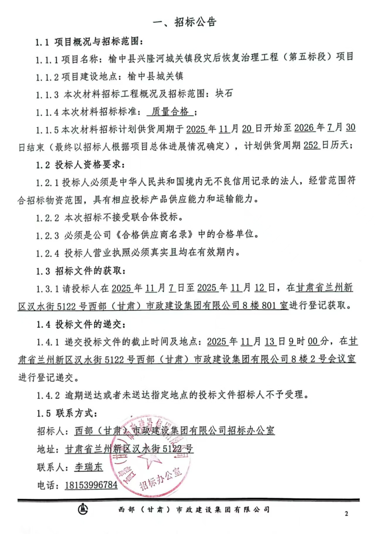 榆中縣興隆河城關鎮(zhèn)段災后恢復治理工程(第五標段)項目-塊石招標公告